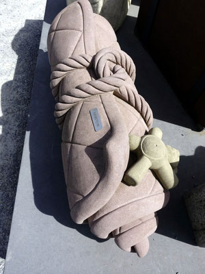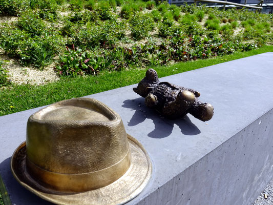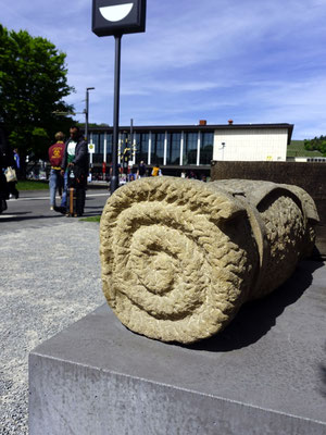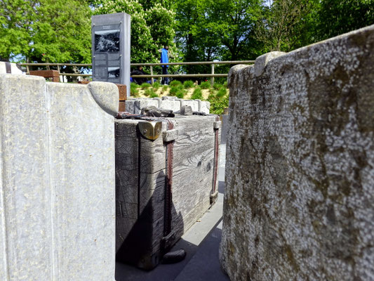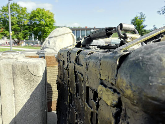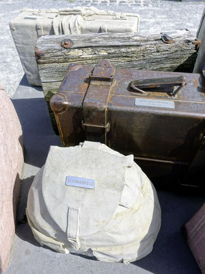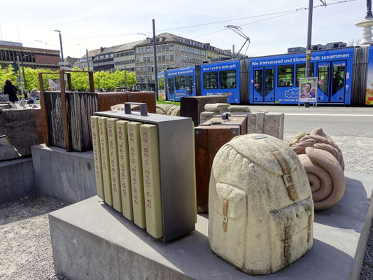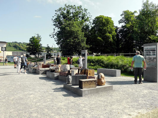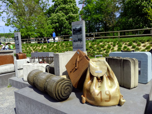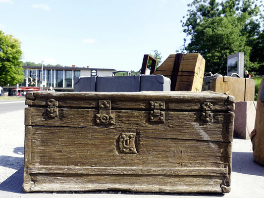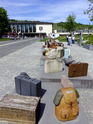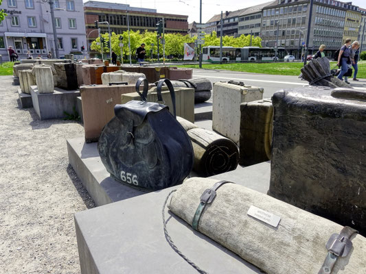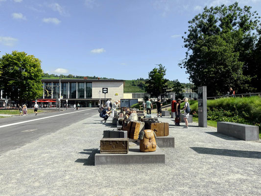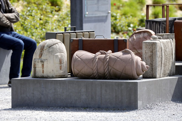 Konzept: Beton-, Holz- und Metallobjekte in Form von Koffern, Rucksäcken und Deckenrollen, ergänzt durch Info-Stelen und QR-Codes zur historischen Kontextualisierung